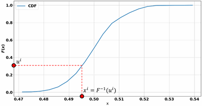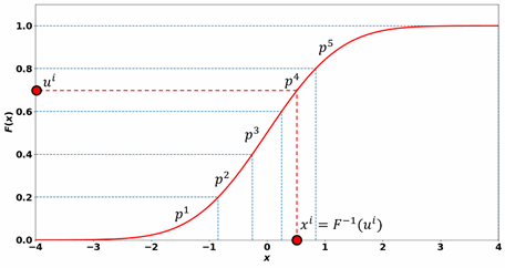 样本点(此输入参数的值)通过在 CDF 的反转函数 上映射 0 与 1 之间的随机样本点 来选择: