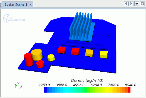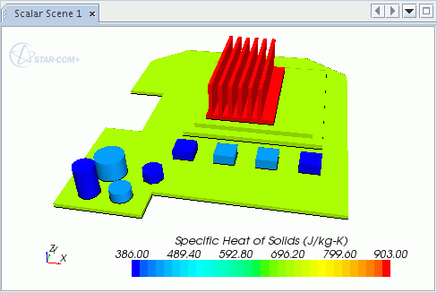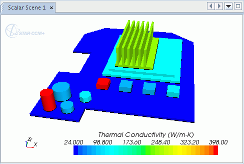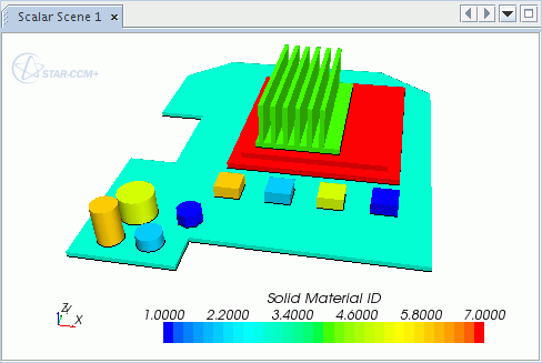 例如,假设要查看场景中的哪些零部件由锌组成。 在连续体模型的固体管理器中,选择 Zn(锌) 组分节点,并获取 ID 号(在此例中为 1)。 要将该编号与标量场景中某些零部件的颜色相关联,可查看场景中的颜色条 -- 具有关联颜色的零部件由锌组成。