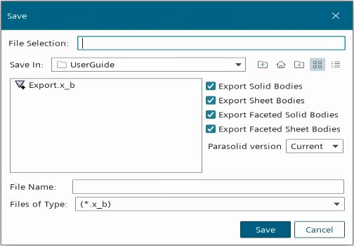 如果要导出小平面模型,选择 Parasolid 二进制 (.x_b) 导出文件格式。或者,如果要将模型连同体和体组中的装配结构及其关联元数据一起导出,选择 PLMXML (.plmxml) 导出文件格式。可以选择体的基础部件文件格式,以导出为 Parasolid、IGES 或 STEP 文件格式。