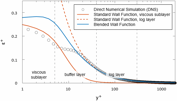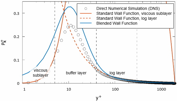 湍流的壁面函数描述了无量纲湍流耗散 无量纲特定湍流耗散 在内湍流边界层三个子层中的分布。没有壁面函数可用于已修正扩散率 和湍动能 ,因为这些物理量严重取决于流的雷诺数。但是,其产生项 和 显示通用行为并可用壁面函数描述。