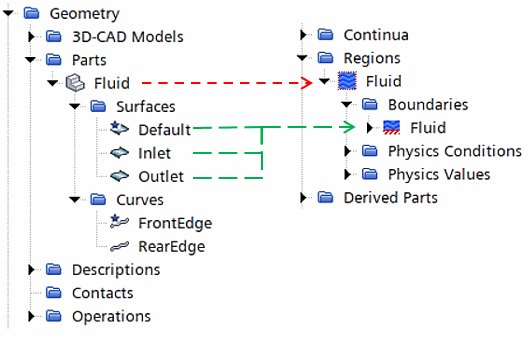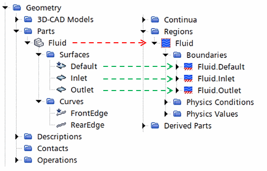 如果将几何导入 Simcenter STAR-CCM+,可以选择直接将几何解析为区域、边界和交界面,而无需经过几何部件。这是早期版本 Simcenter STAR-CCM+ 中的默认方法。不过现在建议的方法是,最初使用几何部件,在对表面或部件曲线定义做出任何必需的更改后,将这些部件分配给模拟域。