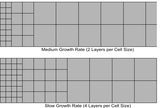 增长率通过指定每个尺寸的最小网格单元层数来定义网格单元尺寸转换。此方法如下图所示: