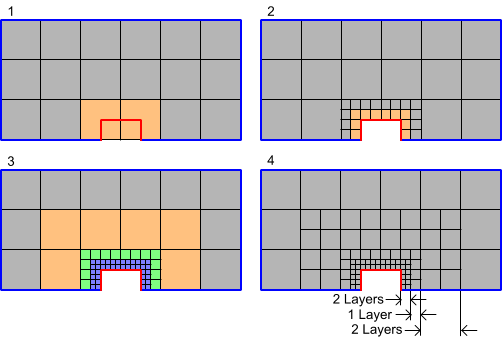 - 图 4:图 3 中的蓝色和绿色网格单元分别为 1 个和 2 个单位的网格单元层;但是,没有 4 个单位的网格单元层。因此,网格生成器将分割图 3 中的米黄色网格单元,创建尺寸为 4 个单位的网格单元。