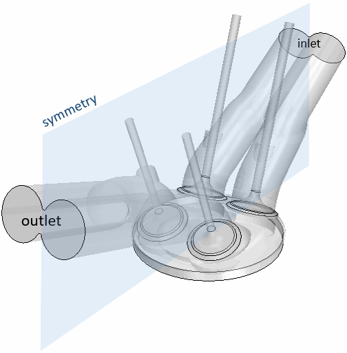 几何包括一个四阀门气缸,在气缸中,活塞位于 TDC 位置,而且阀门处于关闭状态。此设置允许您使用对称条件并只包含一半几何,因此降低了模拟的计算成本。