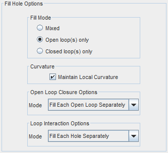 填充开环孔 开环孔填充器将填充由边的不连续环定义的孔。 注 填充开环时,该工具将检查选择中的闭合环,并在找到后取消该命令。 要填充开环孔: 在图形窗口中,选择定义开环和闭合环的边。 单击 (填充孔)工具旁边的三点以显示填充孔选项。 在填充孔选项组合框中: 将填充模式设为仅限开环。 确定是否希望填充区域保持局部曲率。 请参见保持局部曲率。 设置开环闭合选项模式。 请参见开环闭合选项。 设置环相交选项模式。 请参见环相交选项。 要填充孔,单击 (填充孔)。