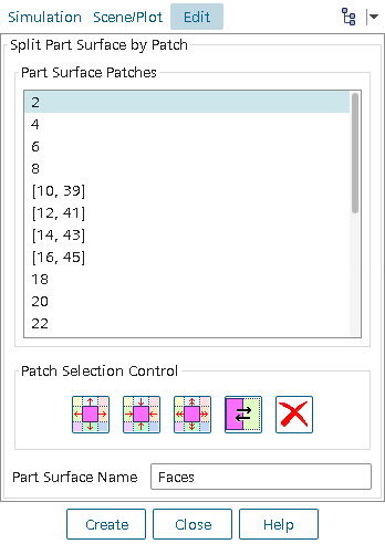 选择根据块分割选项后,有五个块选择控制工具按钮可用。从部件表面块组合框或图形窗口的“几何”中选择部件表面块后,这些按钮将变为活动状态。使用键盘上的 <向上> 和 <向下> 箭头键可在块间切换。如果选择了部件表面的所有块,则只有 Patch Clear(块清除) 和 Patch Shrink(块收缩) 按钮可用。