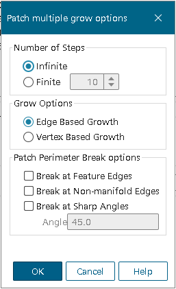 提供的中断选项类似于表面修复中的选项。但是,只能针对块周长评估中断选项条件,而不能针对块内部进行评估。例如,如果某个块包含内部锐角(与块周长的锐角相对),则会忽略此锐角,从而始终完全增长到该块。同样,也会忽略块中包含的部件曲线和非流形边。无论块内的中断选项特征为何,都无法增长到部分块,只能增长到整个块。