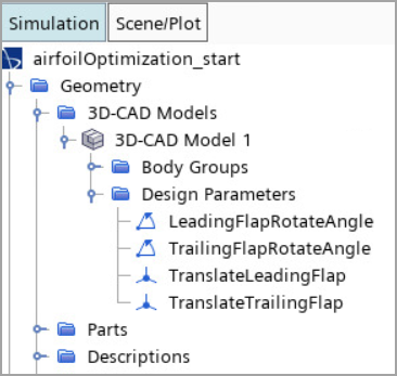 参考模拟已包含定义襟翼位置的 3D-CAD 设计参数,以及计算升力与阻力的报告。要查看设计参数和报告: