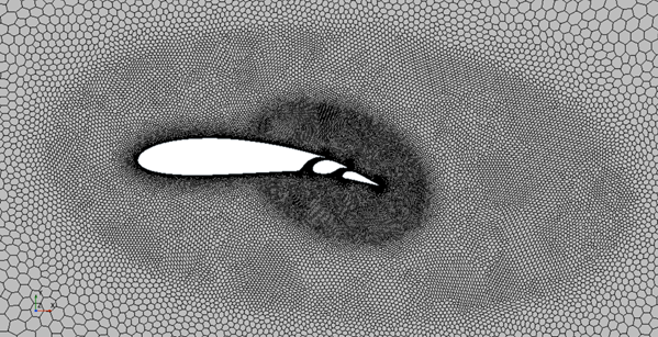 开始位置模拟包含可随时执行的网格操作。此操作生成在翼面襟翼周围细化的 2D 多边形网格。棱柱层进一步细化翼面表面附近的网格。