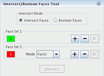 使用相交/布尔运算选定面工具可针对两个面集合执行相交或布尔运算操作。由于此工具仅在三角形面上操作,因此输入集中的任何四边形面都被分解为三角形。