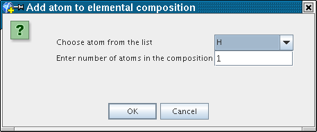 选择新建原子将打开添加原子至元素成分对话框,可在其中设置分子中的物质及其量。 可从下拉菜单中选择可用物质,并在输入框中输入选定物质的原子数量