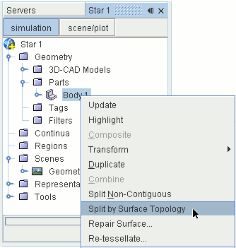 它与用于分割区域的方法类似。 该操作基于零部件定义的闭合、流形和非相交表面的拓扑。 当评估表面时,Simcenter STAR-CCM+ 会将包含在一个零部件内的表面视为单个表面。 在执行该操作前,不需要组合或分割任何表面。
