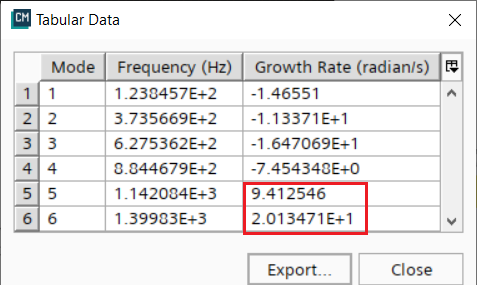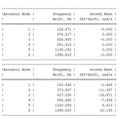 第一个表显示非反应计算的声学模态。此表不提供有关增长率的任何信息。第二个表显示使用 N-Tau 模型求得的结果,以描述火焰传递函数。这些结果包括基于增长率的每个模态的稳定性信息。还可以使用声学频率表选项对第二个表进行制表。