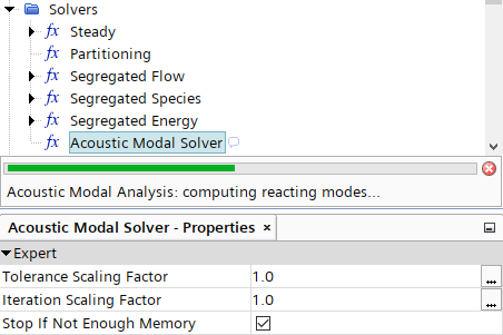 - 右键单击节点并选择求解声学模态。进度显示在属性窗口上方的条中。