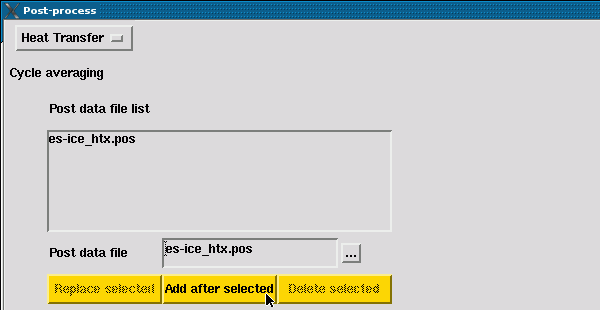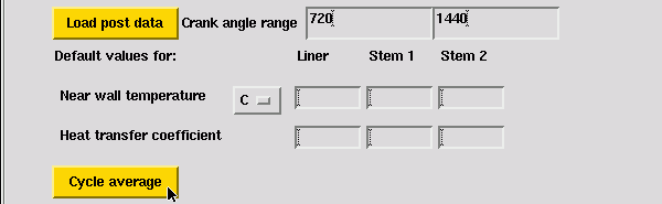 - 单击 Load post data(加载后处理数据),然后输入适当的 Crank angle range(曲柄角度范围) 以涵盖最后一个完整的发动机循环。之后,单击 Cycle average(循环平均),计算循环平均壁面热传递数据。在第一个文本字段中输入起始曲柄角度(上述方程中的 ),在第二个文本框中输入结束曲柄角度 ()。