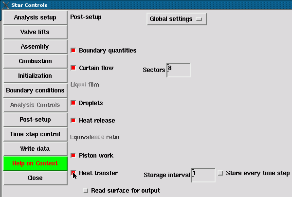 - 在 Star Controls(Star 控制) > Post-processing(后处理) > Global Settings(全局设置) 面板中选择 Heat Transfer(热传递) 选项后,运行 es-ice 分析。这将在 STAR 获取求解时生成热传递数据 (es-ice_htx.pos)。