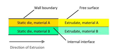 当相之间的交界面大致位置已知时,自由表面模型是首选方法,因此可以指定多个区域之间的初始交界面位置,并使用 ALE 计算最终位置。在模唇之后材料相互接触的情况下,自由表面模型也很有用。