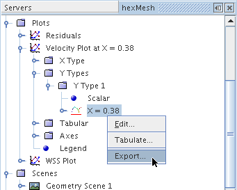 导出模拟数据 将速度图数据导出至文件,以便与使用其他两种网格生成的类似数据进行比较。 打开绘图 > X = 0.38 时的速度图 > Y 类型 > Y 类型 1 节点。 右键单击其中的 X = 0.38 节点并选择导出。 在保存对话框中,输入 hex380 作为“文件名”,然后单击保存。 关闭模拟。 处理六面体网格的部分现在完成。