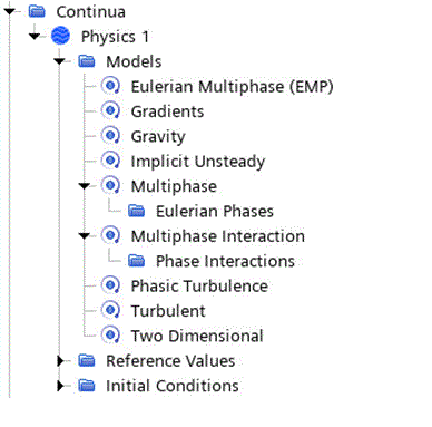 本教程所需的核心物理模型是欧拉多相流模型,它可以为空气-水流提供完整的欧拉求解。此设置的多流态部分在相间相互作用中单独定义。