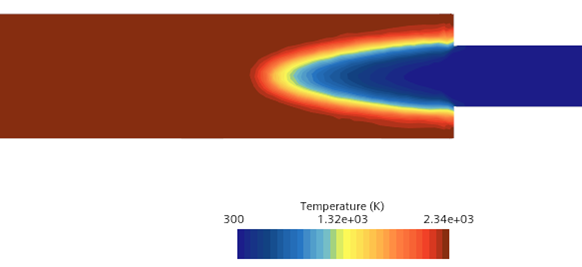 (运行)。 - 打开温度场景。温度分布结果将高亮显示从未燃烧气体变化到燃烧气体的区域,表示此燃烧模拟的火焰前缘。