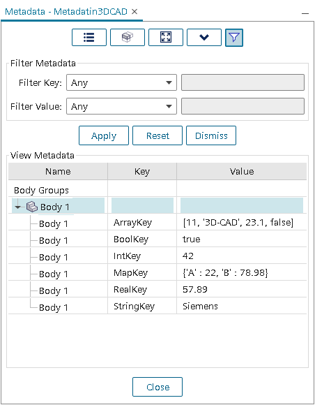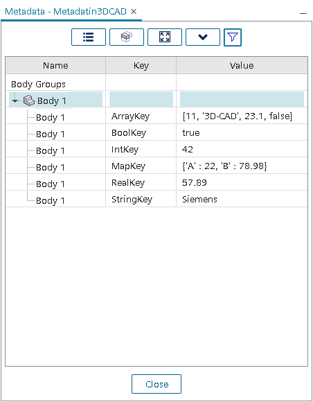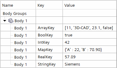 3D-CAD 中的元数据是附加到体或体组的各种文本信息。通常,该元数据来自导入 3D-CAD 的 CAD 包中的文件,尽管 Simcenter STAR-CCM+ 允许添加自己的元数据。