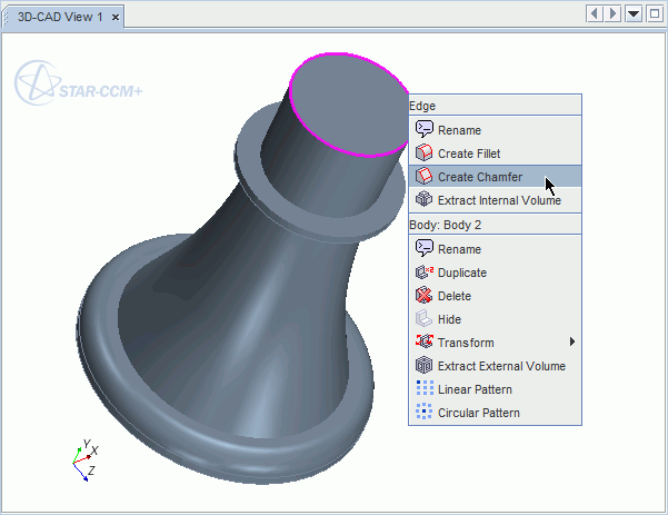 - 在 3D-CAD 视图场景中,右键单击某个边或面,然后选择创建倒角。