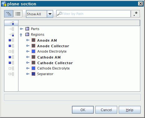 在平面截面对话框中,展开区域节点,然后禁用 Anode Electrolyte、Cathode Electrolyte 和 Separator。