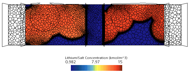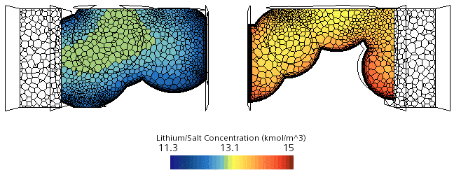 通过查看此结构中的 Li+ 离子浓度分布,便可以观察是否会随着时间的推移而出现较大的浓度梯度。这些较大的浓度梯度并不是想要的结果,因为它们可能会导致电池单元阻抗增加,而这将导致较大的电势下降,从而对电池单元提供的能量产生不利的影响。