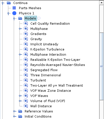 选择物理模型 选择此模拟所需的物理模型。 返回模拟。 右键单击连续体 > 物理 1 > 模型节点,然后选择选择模型... 在物理 1 模型选择对话框中: 从时间组合框中选择隐式非定常。 从材料组合框中选择多相。 从多相流模型组合框中选择流体体积 (VOF)。 从粘滞项组合框中选择湍流。 从雷诺平均湍流组合框中选择 K-Epsilon 湍流。 从可选模型组合框中选择重力、网格单元质量校正和 VOF 波。 单击关闭。