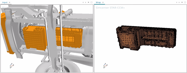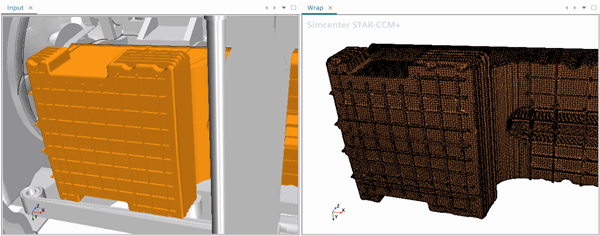 加密油槽上的包面 全局包面中丢失了油槽表面的一些细节。 隔离油槽: 在 Wrap(包面) 场景中,右键单击油槽,然后选择仅显示此零部件。 油槽 oilSump_1872 在场景中已隔离。 创建局部范围: 右键单击操作 > 包面 > 局部范围节点,然后选择新建 > 表面范围。 由于油槽的整体分辨率较差,因此选择了表面范围。如果只需对油槽的某一部分进行加密,则将使用体积范围。 将表面范围重命名为 Oil Sump(油槽)。 定义表面范围: 在 Wrap(包面) 场景中,右键单击油槽,然后选择选择继承自以选择与场景中的包面对应的零部件表面。 按 <Ctrl> + <C> 将零部件表面复制到剪贴板。 选择操作 > 包面 > 局部范围 > Oil Sump(油槽) 节点,然后使用 (从剪贴板粘贴选择内容)设置零部件表面。 选择 Oil Sump(油槽) 节点,然后将膨胀距离设为 20.0 mm。 如果设置的膨胀距离过小,包面可能会失败。通常,表面范围的膨胀距离必须是局部表面尺寸的三倍左右。在这种情况下,膨胀距离 15.0 mm 适用。 创建并定义一个自定义控制,用于加密油槽周围的包面: 右键单击操作 > 包面 > 自定义控制节点,然后选择新建 > 面控制。 将面控制重命名为 Oil Sump Refinement(油槽加密)。 在 Wrap(包面) 场景中,右键单击油槽,然后选择选择继承自以选择与原始零部件对应的零部件表面。 按 <Ctrl> + <C> 将零部件表面复制到剪贴板。 选择操作 > 包面 > 自定义控制 > 油槽加密 节点,然后使用 (从剪贴板粘贴选择内容)设置部件表面。 编辑 Oil Sump Refinement(油槽加密) 节点并设置自定义控制设置,如下所示: 节点 属性 设置 控制 目标表面尺寸 目标表面尺寸 自定义 最小表面尺寸 最小表面尺寸 自定义 值 目标表面尺寸 尺寸类型 绝对值 绝对尺寸 5.0 mm 最小表面尺寸 尺寸类型 绝对值 绝对尺寸 5.0 mm 执行包面。 包面现在成功且油槽已正确求解。 在 Wrap(包面) 场景中,右键单击空白区域并选择恢复所有隐藏的零部件。 保存模拟。