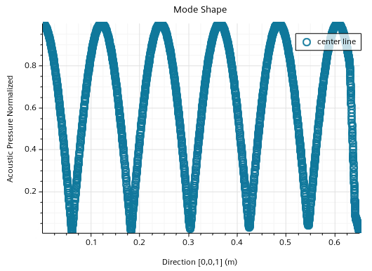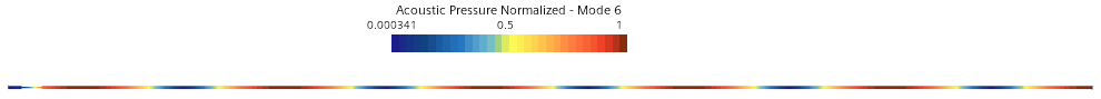 - 选择节点,并从 1 到 6 编辑声学模态的值。中心线模态形状绘图将更新,以显示中心线部件上所有六个声学模态形状。下图显示了模态 6 的中心线模态形状的示例,该形状强调此模态的变化幅值和频率。如声学频率表结果所示,此模态的增长率为正,因此压力波动预计将随着时间增长,并且模态不稳定。