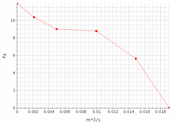 为了建模整个轴流风扇的压力升高,Electronics Cooling Toolset需指定风扇性能曲线。 风扇性能曲线将风扇压力升高描述为体积流率的函数。 本教程中使用的风扇性能曲线如下所示。 该曲线对应的风扇工作时旋转速率为 1200 转 / 分。