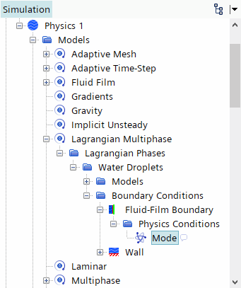 在底面边界上创建壳区域时,Simcenter STAR-CCM+ 将展示一个边界条件模式,用于指定将液滴转换为液膜。