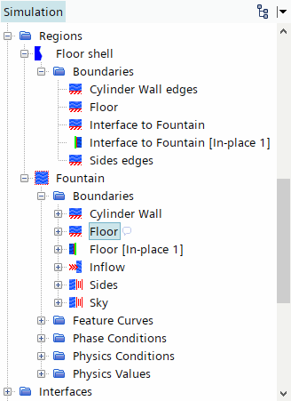 VOF 水射流以 5 m/s 的速度进入流入边界的计算域。域的顶面和侧面被指定为允许回流的压力边界。这些边界类型已在起始模拟文件中定义。