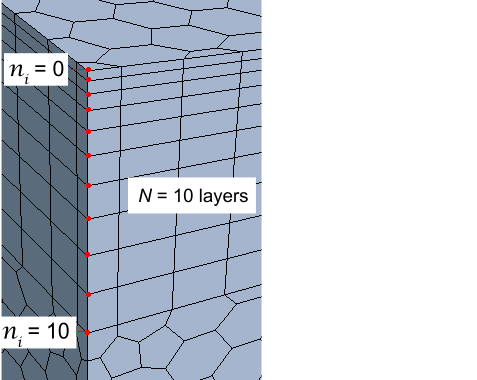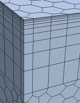 上图显示了层数为 10 且总体棱柱层延伸因子为 1.5 时的分布。 层之间的尺寸比率不再是常数,而是修改为使整个棱柱层的网格单元厚度之间的过渡更平滑。 此选项可用于减小近壁棱柱层的间距,同时避免外部棱柱层出现大间距。