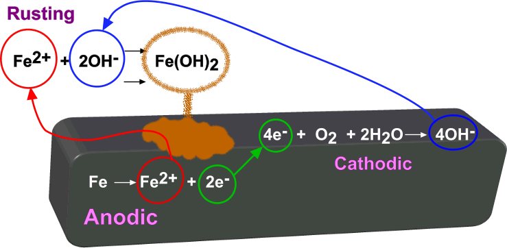 The following example shows the electrochemical reactions that occur within, and surrounding, an iron surface that is in contact with water and oxygen.