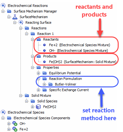 When using the Electrochemistry Reacting model with the Electrochemical Species model, you can specify reaction methods and create mechanisms for electrochemical surface reactions which include reactant and product species that you specify. Specifying species allows you to include the effects of the ion concentrations on reactions. You can choose a coupled or segregated approach to solve for electrochemical species concentrations.
