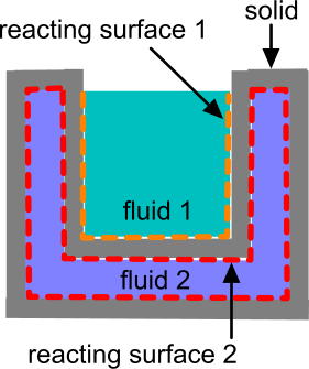 This feature is compatible with solid shell regions, fluid films, and porous phases. However, you can only define reactions at interfaces between solid and fluid physics continua, you cannot define the reacting surface interface between two solids. See Modeling Electrochemical Surface Reactions.