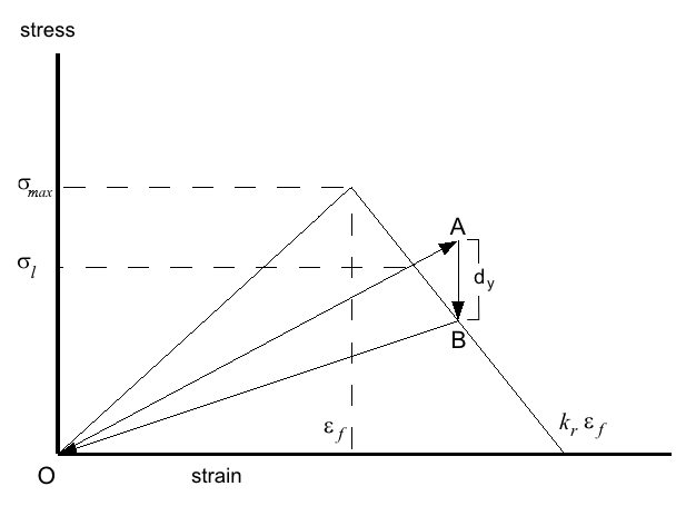 The point ( , ) is the point of strain at failure and maximum stress induced by that strain. Once conditions reach the point ( , ), the model calculates the damage required to return the stress to the failure surface, defined by the line from ( , ) to ( , 0), where is the fracture softening modulus, a model parameter with default value 2 at constant strain. For stability, should be greater than 1. [727]