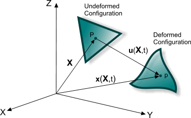 应用的负载可导致固体结构产生从初始配置到变形配置的位移。 总位移由刚体运动和体中各点的相对位移(决定固体结构的变形)共同组成。