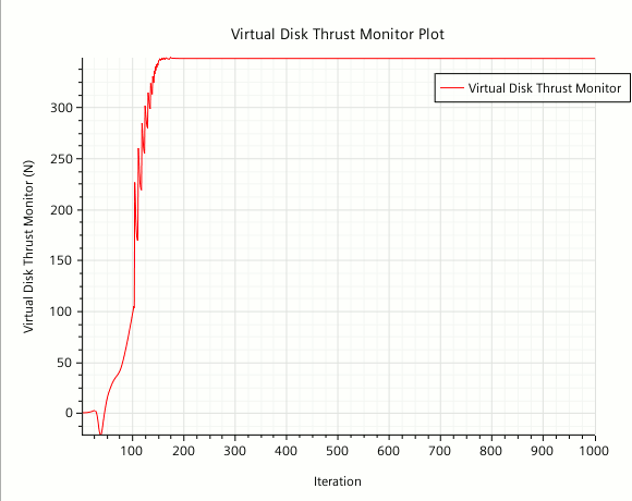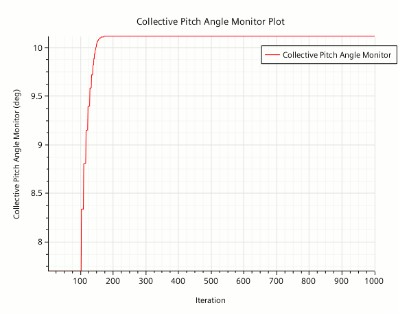 利用这两个曲线,您可以监视切割过程,即您可以跟随总俯仰角的变化及其对应的推力变化。对于前 100 次迭代,旋转速率从 1 线性阶跃到指定的 2000 rpm。在此期间,总俯仰角在指定值 7.7° 处保持恒定。在 100 次迭代后,Simcenter STAR-CCM+ 激活切割算法。您可以发现总俯仰角非线性增加,随着运行收敛,在大约 500 次迭代后,达到恒定值。激活切割算法后,使用变化总俯仰角计算推力。调整总俯仰角,直到达到指定的目标推力。