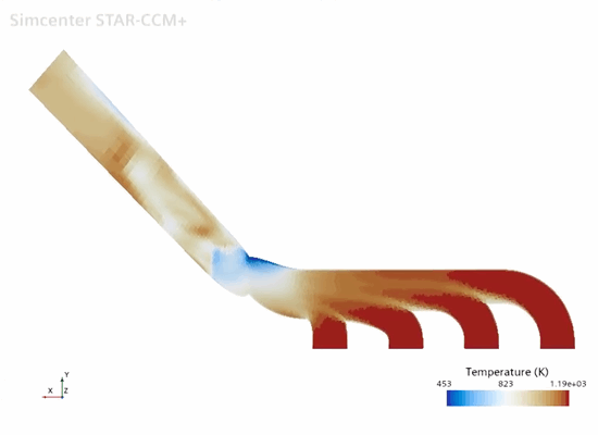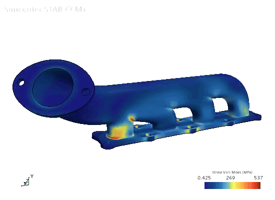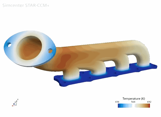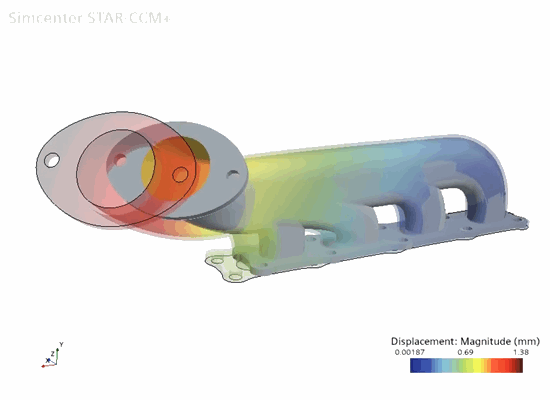 In this tutorial, you study the thermal expansion of an exhaust manifold in response to hot gas entering the inlets. The simulation incorporates both conjugate heat transfer (CHT) between the solid and the fluid, and thermal expansion in the solid due to the temperature changes. For the gas, you solve for fluid flow and energy using the FV method; for the manifold, you solve for the solid temperature and corresponding thermal stress using the FE method.