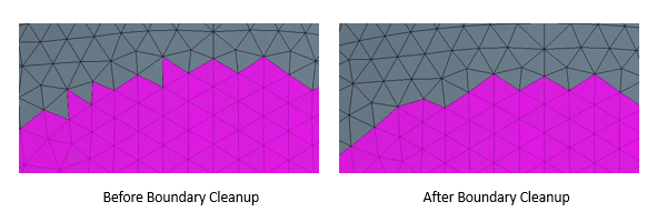 This option adds or removes faces along the boundary. A face is only identified by the clean-up process if:- The face has more than two (triangle) or three (quadrilateral) adjacent faces which do not belong to the same subset (classified or unclassified) as the face in question.