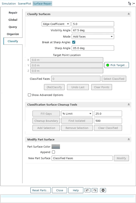 This approach maintains the existing part surface distribution, as it creates a new part surface for each classified surface. The name of the new part surfaces is the format [part surface name]_[append name]. The state of the append options is saved and restored in the simulation file.