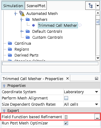 应用场函数或网格尺寸表 最后阶段是向网格化模型属性应用场函数或网格尺寸表。 将场函数或网格重定义表分配给网格化模型: 选择自动网格 > 网格生成器 > [网格生成器] 节点并单击基于场函数的细化的自定义编辑器。 在基于场函数的细化对话框中,选择场函数或网格重定义表。 现在可以按照面网格生成器和体网格生成器的常用方法重新生成网格。