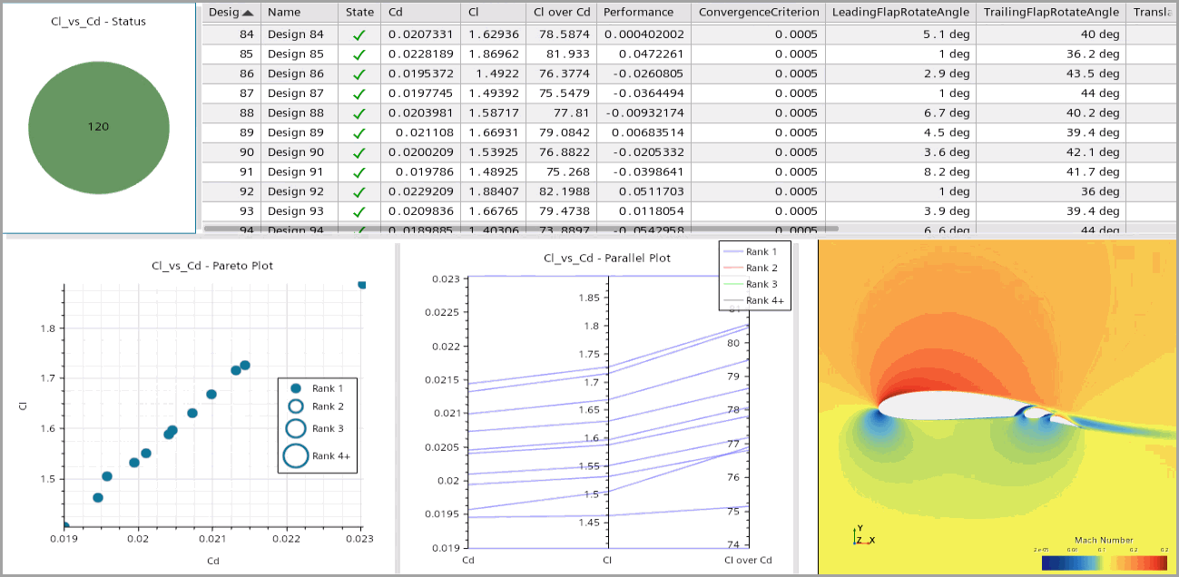 - Parallel Plot of the responses Cl, Cd, and Cl over Cd.