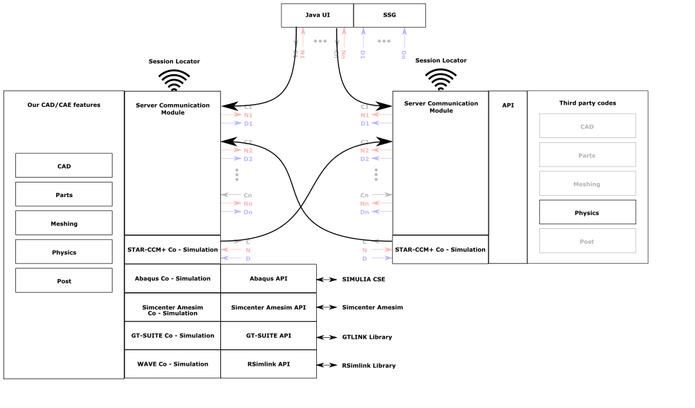 初始化时,协同仿真 API 将在启动合作伙伴软件的同时启动伴随 Simcenter STAR-CCM+ API 服务器。协同仿真期间,伴随 Simcenter STAR-CCM+ API 服务器与其他 Simcenter STAR-CCM+ 服务器通过使用相同的协议作为两个 Simcenter STAR-CCM+ 模拟之间的协同仿真来进行通信。合作伙伴软件调用协同仿真 API 库,以便从伴随 Simcenter STAR-CCM+ API 服务器中接收数据并向其传递数据。