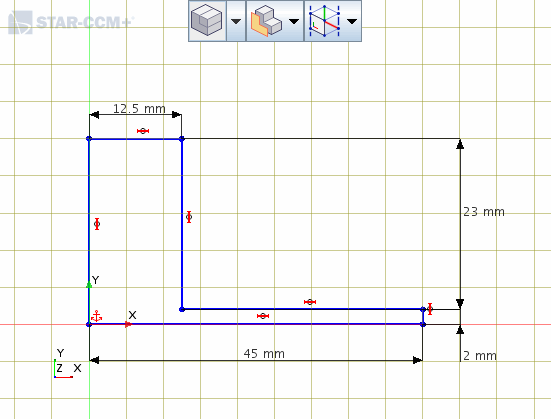 从之前的端点开始,使用线工具即可完成草图绘制,如下所示。画完每条线后,无需按 <Esc>,继续单击,直到最后单击初始线段的起点。绘制水平线时,这些线均以黄色显示。垂直线显示为红色。确认草图位置后,所有线均以默认蓝色显示。