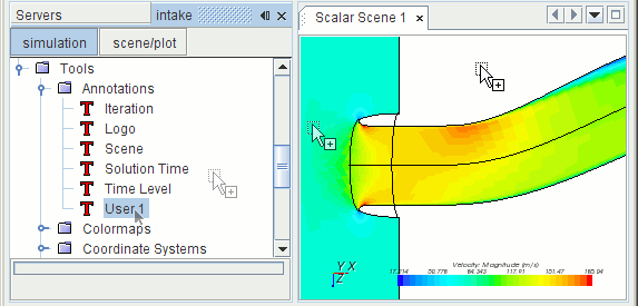 在以下示例中,已结合使用应用注释与标准化视区坐标系将标题添加到 Scalar Scene 1(标量场景 1) 显示。还使用全局坐标系添加了标签。