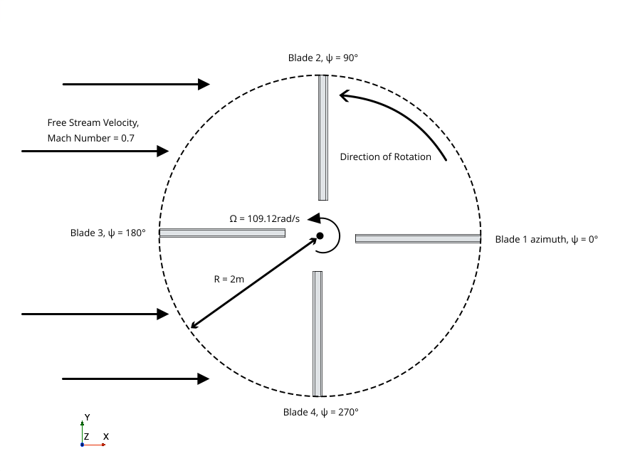 本教程的条件和几何遵循 HART-II(高次谐波控制气动声学转子测试)设置。HART-II 是一种测试,通常用于根据实验数据验证转子叶片气动弹性特性。此模拟是叶片涡流相互作用研究 - 尾流与转子相互作用,从而对叶片负载和变形产生显著影响。